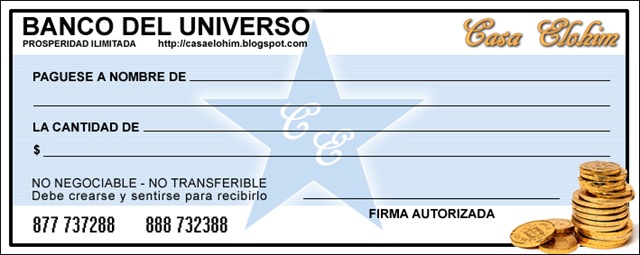 El Cheque de la Abundancia se puede hacer tanto en una hoja en blanco, un formulario pre-impreso como el que se puede conseguir en Casa Elohim, o en un cheque real emitido por un banco.