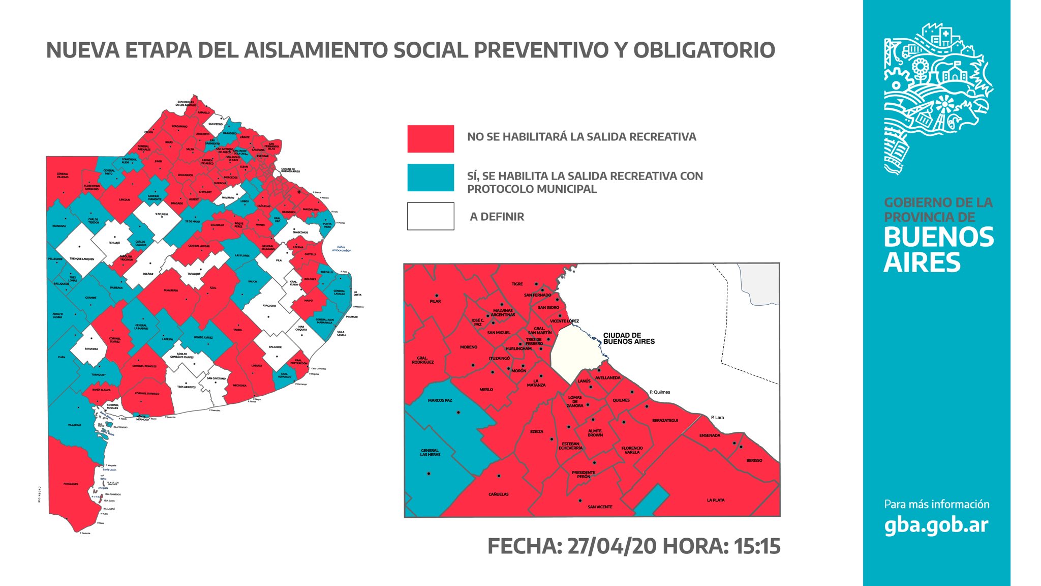 Para evitar la proliferación de versiones, Axel Kicillofok ha publicado un mapa indicando cuáles son los municipios en los que se permitirán y no se permitirán salidas de esparcimiento durante esta nueva etapa de la cuarentena obligatoria. Sin embargo, él aclaró que cada municipio puede ir modificando su situación con el correr de las horas.